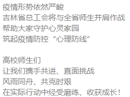 啟動(dòng)疫情時(shí)期吉林工會(huì)云課堂特別系列課程,為高校學(xué)生提供心理自助資源,圍繞疫情期間的自我心理調(diào)適、生活適應(yīng)、情感輔導(dǎo)和職業(yè)規(guī)劃等主題內(nèi)容,推出線上系列直播課程。